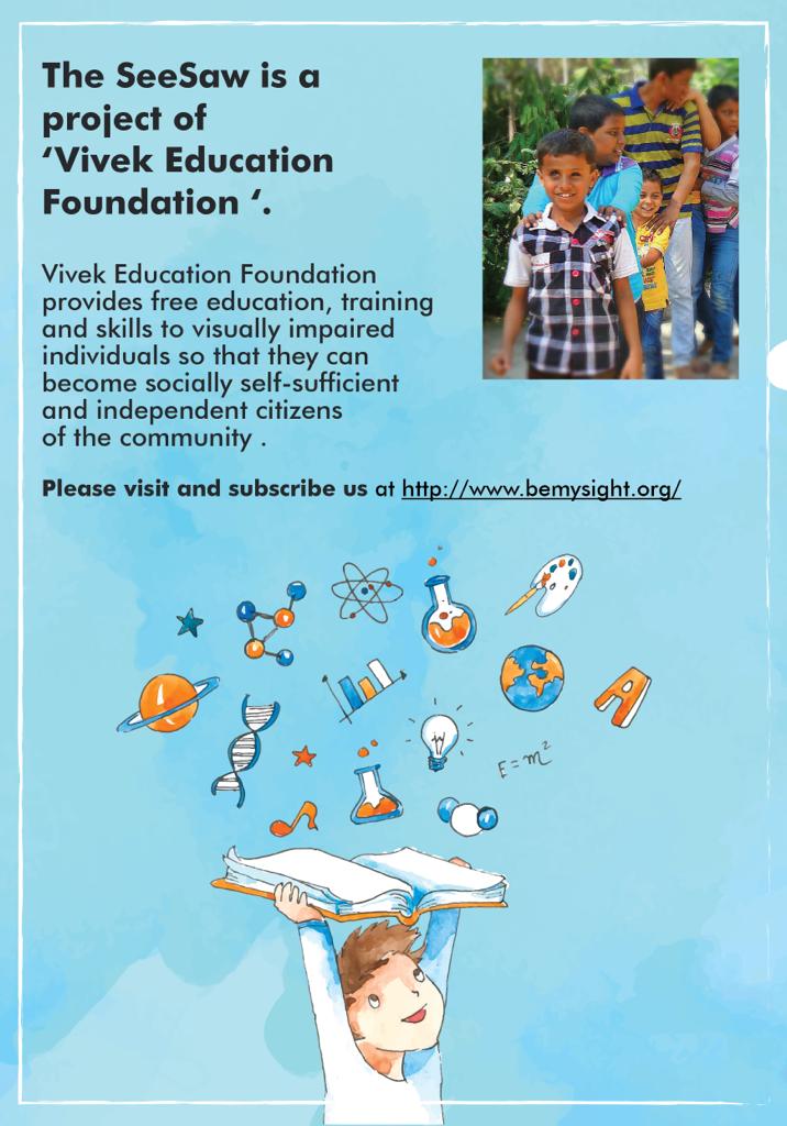 Subscribe to our monthly magazine SeeSaw designed to nourish young minds with inspiring articles and fun filled-activities. Your subscription will help fund Vivek Education Foundation’s goals of providing quality education and skills to the visually impaired.
